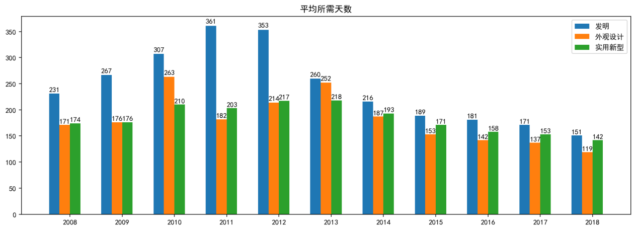 (2)无论在哪一个年度,发明专利的耗时都要比其它二者更长;一般情况下,外观设计专利用时最短。