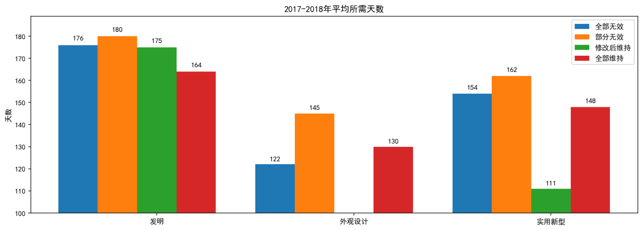 上图为按专利类型统计的无效请求作出决定平均所用天数。总体上看,发明专利无效决定的用时要多于外观设计专利和实用新型专利,其中,每一类型下都是部分维持的决定耗时最久。这可能是由于与全部维持或者全部无效相比,部分维持的案件可能相对更加复杂,更难以作出决定。