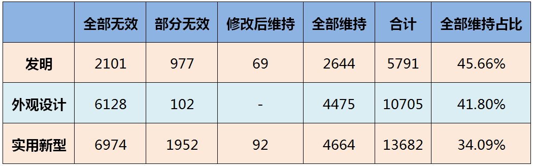 上表为按专利类型统计的各种情况的案件数量。总体上看,发明专利宣告维持的比例要远高于外观设计专利和实用新型专利,即专利被宣告无效的概率从发明专利到外观设计专利再到实用新型专利是逐步增加的,这也与我们一般的认识相符。某种程度上,实用新型专利的低稳定性,大幅增加了专利整体被宣告无效的比例。