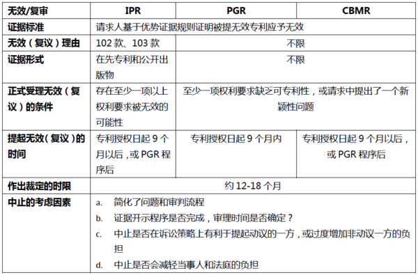 1、行政途径。AIA修改和新增了三种无效(复议)程序,分别是Inter Partes Review (简称IPR),Covered Business Method Review (简称CBMR),和Post-Grant Review (简称PGR),由于找不出妥帖的与之对应的中文翻译,故下文均以简称特指对应的程序。