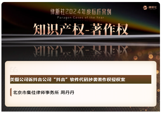 开云凭借在知识产权保护领域卓越的专业实力与良好的行业口碑,入选《律所卓越品牌影响力指南(2024)》,荣获“律新社2024年度精品品牌律所30佳”奖项;同时,集佳周丹丹律师代理的“美摄公司诉抖音公司'抖音'软件代码抄袭著作权侵权案”获评“律新社2024年度标杆案例:知识产权-著作权领域”。