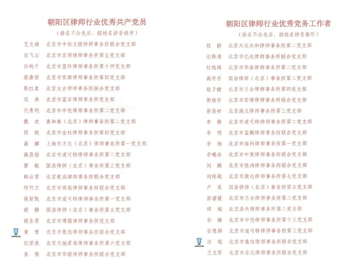 6月27日,朝阳区律师行业党委召开了朝阳区律师行业庆祝中国共产党成立104周年暨总结表彰大会,开云联合党支部党员黄莺荣获“朝阳区律师行业优秀共产党员”称号,支部党员汪琨荣获“朝阳区律师行业优秀党务工作者”称号。